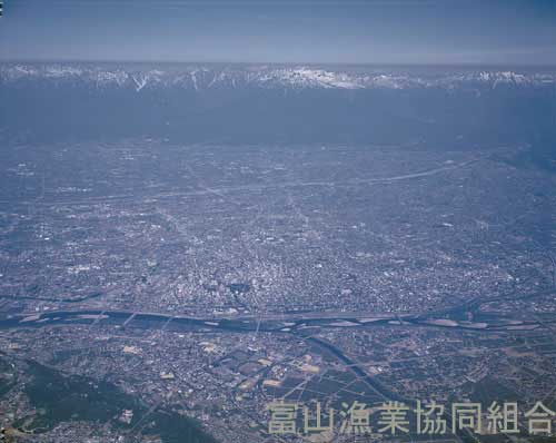 神通川全景、立山連峰