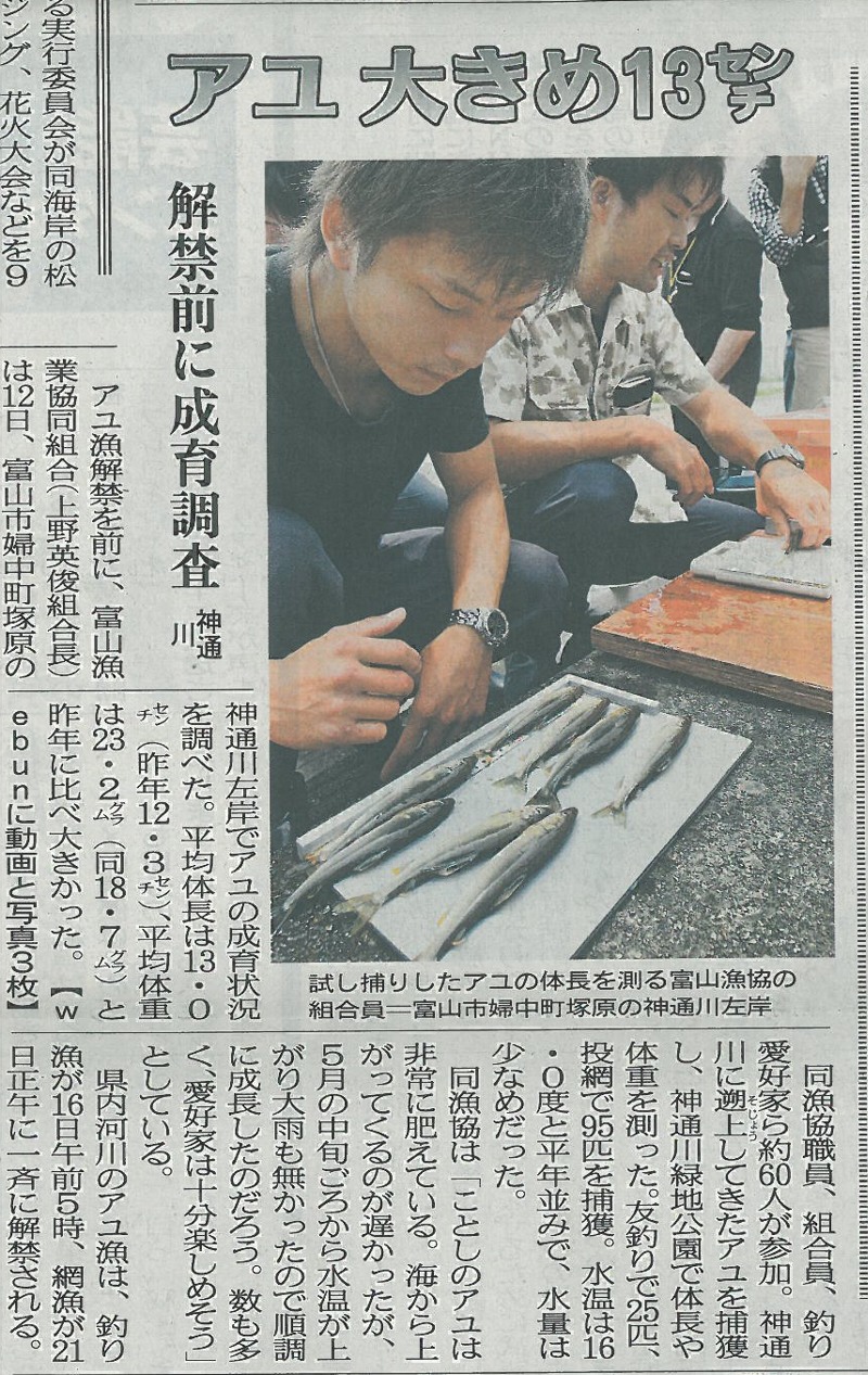 6月10日に行なった河川一斉清掃で、一般の参加をいただいた富山小林製薬(株)40人の皆様の写真を掲載させていただきます。![]() ご協力ありがとうございました。 昨日のアユ成育調査の記事が北日本新聞に載っていました。 ![]() 朝8時の大沢野大橋の水量は32.0t、水位は1.50m、萩浦橋の水温は昨日の最高が17.4℃、今朝8時で15.9℃、濁度―度、昨日の最高気温は24.0℃、今朝の気温は22.0℃ 濁度は異常値が続いているので載せません。 |