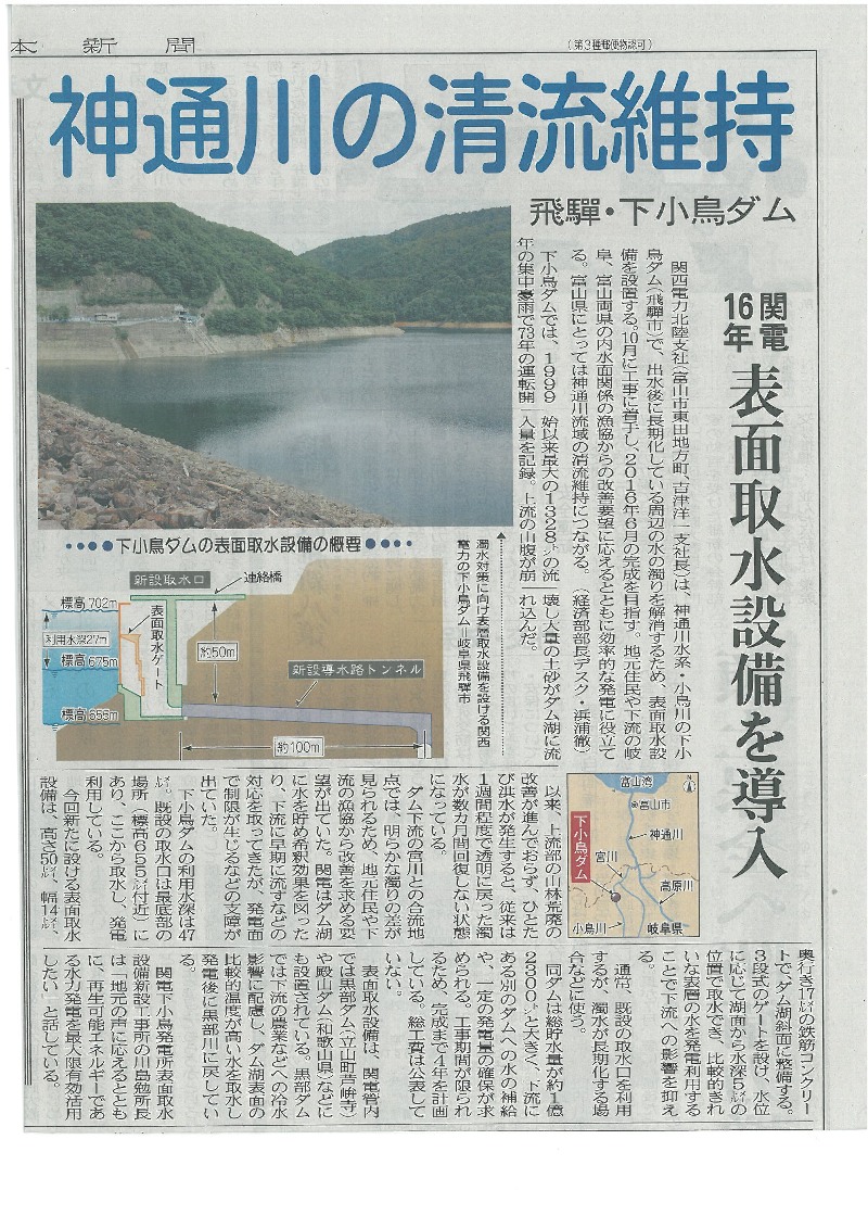 昨日は県外の釣り人から、川の状況を確認する電話がたくさん入りました。今日辺りから週末に掛けて釣行予定の人が、ニュースなどで北陸地方の大雨情報や、富山県の大雨洪水注意報を見て、神通川が増水していないかの問い合わせでした。 幸い、神通川流域は飛騨地方も含めて大雨にはならなかったので、渇水ぎみの平水で濁りなしです。 福島や東京の人、いかにも大阪というような人、四国の人からもありましたが、釣雑誌やブログで見たので是非来たいそうです。現在は一時期のような釣果は望めなくて、特に昨日は雨降りだったせいか釣果の方は良い情報がありません。 期待を裏切るようなことにならないか心配です。 9月6日北日本新聞に「神通川の清流維持」の記事が載っていました。 ![]() 平成11年の飛騨大水害があった後、何年かに一度は夏場に濁水が続き、アユ釣に影響が出ていたため、関電に表面取水設備の設置を要望していましたが、ようやく工事着手されることになりました。 下小鳥ダムは宮川の支流小鳥川にあるロックフィルダムですが、神通川水系で唯一の流量調整貯水型ダムで、夏場の渇水の時には一定量の水量が確保されてメリットが大きいのですが、一端ダム湖が濁ると濁りが長期化するデメリットもあります。 この選択表面取水設備ができることによってデメリット部分の解消が期待されます。 朝8時の大沢野大橋の水量は27.3t、水位は1.45m、萩浦橋の水温は昨日の最高が22.7℃、今朝8時で20.6℃、濁度5度、昨日の最高気温は29.1℃、今朝の気温は26.0℃ |