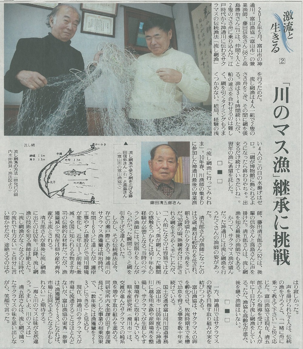 2013仕事始め。 1月3日読売新聞に「激流に生きる2 川のマス漁継承に挑戦」の記事が載っていました。 ![]() 昔はサクラマス漁と言えば流し網でしたが、今は許可が残っているだけのような状態で、技術を継承しないと漁として無くなりそうです。 この記事のために、何時間取材を受けたでしょうか。記者の方も熱心でした。 朝8時の大沢野大橋の水量は58.3t、水位は1.68m、萩浦橋の水温は昨日の最高が3.5℃、今朝8時で3.2℃、濁度0度、昨日の最高気温は−0.3℃、今朝8時の気温は−2.2℃ |