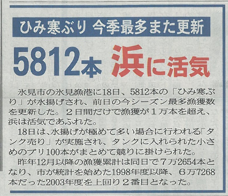 今日からセンター試験が始まりました。受験生の皆さん、日頃の実力が発揮できるよう頑張ってください。 試験日は混雑するので、大学の前を避けて裏道から来ました。 今朝の北日本新聞に「ひみ寒ぶり今季最多また更新5812本 浜に活気」の記事 ![]() 今日もひみ寒ぶりを食べるかな。 サケ採捕者から「ブリの豊漁の年はサケが少ない」という話しを初めて聞きました。関連性があるとすれば海水温の影響くらいでしょうが本当ですかね? 朝8時の大沢野大橋の水量は12.6t、水位は1.29m、萩浦橋の水温は昨日の最高が4.1℃、今朝8時で3.3℃、濁度―度、昨日の最高気温は−0.1℃、今朝8時の気温は−0.3℃ |