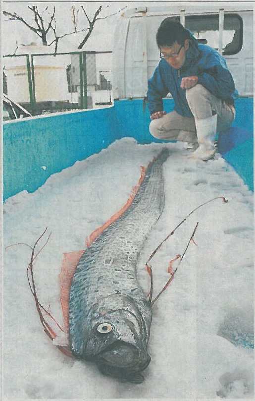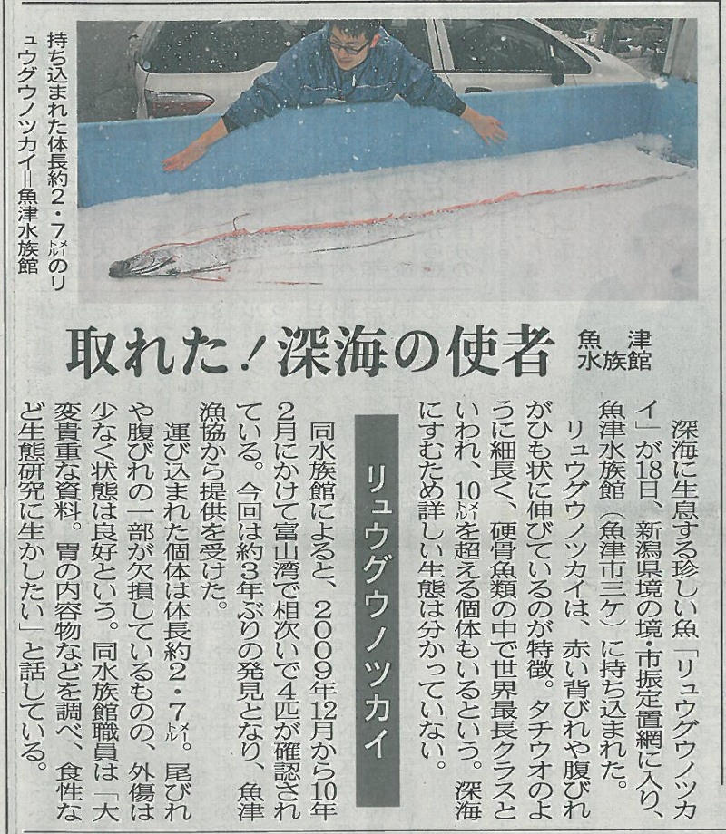 今朝は寒中としては穏やかな日になっています。 昨日の北日本新聞に「取れた深海の使者」の記事が載っていました。 ![]() 以前にもこの記事を使わせてもらった記憶がありますが、もう3年前になりますか。 富山新聞には「地震の前に姿を現すとも言われているが関連は何も分かっていない」と書いてありました。 富山新聞は写真だけ使わせてもらいます。こちらの方がインパクトがありそうなので。 ![]() 朝8時の大沢野大橋の水量は5.7t、水位は1.18m、萩浦橋の水温は昨日の最高が4.4℃、今朝8時で3.9℃、濁度―度、昨日の最高気温は3.5℃、今朝8時の気温は1.6℃ |