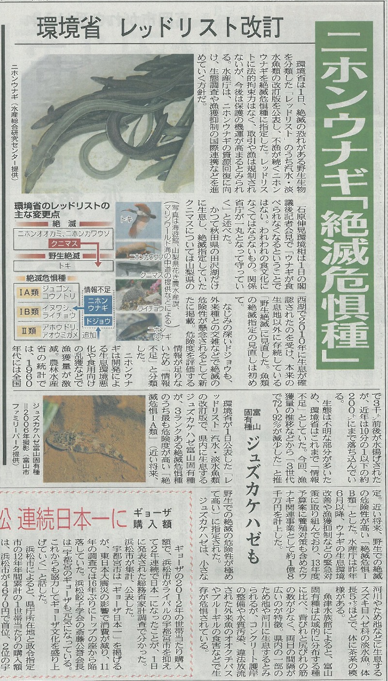 昨日の北日本新聞に“ニホンウナギ「絶滅危惧種」”の記事が載っていましたが、富山新聞では1面トップの扱いでした。![]() ウナギの減少は河川環境の変化も大きいのでしょうが、シラスウナギの乱獲も大きな影響があると言われています。 ウナギは晩秋から今頃にかけてシラスウナギになって河川にそ上してきて、3年から10年をかけて親魚に成長し、秋から冬に増水の時に降海して、マリアナ海嶺あたりまで行って産卵するそうですが、養殖の種苗用としてシラスを大量に捕られてしまうと、産卵する親魚が減り、それがシラスウナギの減少に拍車をかける、負のスパイラル状態なのでしょう。 アユのように1年魚なら資源回復も早いでしょうが、ウナギは厳しいかもしれません。 またドジョウや絶滅危惧種2種にハマグリ、準絶滅危惧種にはトノサマガエルなど普通にいると思っている生物がレッドリストの中に含まれていることが驚きです。 そういえばトノサマガエルは近頃見たことがないかもしれません。 朝8時の大沢野大橋の水量は75.4t、水位は1.78m、萩浦橋の水温は昨日の最高が5.7℃、今朝8時で4.6℃、濁度―度、昨日の最高気温は11.2℃、今朝8時の気温は3.1℃ |