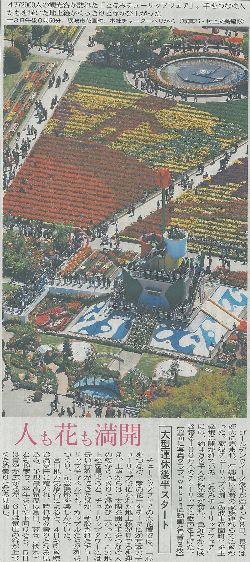大型連休2日目、少し風は強いながらも快晴になっています。 行楽地はどこも賑わっているようで、今朝の北日本新聞には「となみチューリップフェア」の記事が載っていました。 ![]() 連休中は良い天気が続きそうです。 朝8時の大沢野大橋の水量は53.6t、水位は1.65m、萩浦橋の水温は昨日の最高が12.6℃、今朝8時で9.0℃、濁度9度、昨日の最高気温は17.0℃、今朝8時の気温は12.9℃ トップ画面のトピックスに遊漁規則変更の内容を載せてありますのでご確認ください。 |