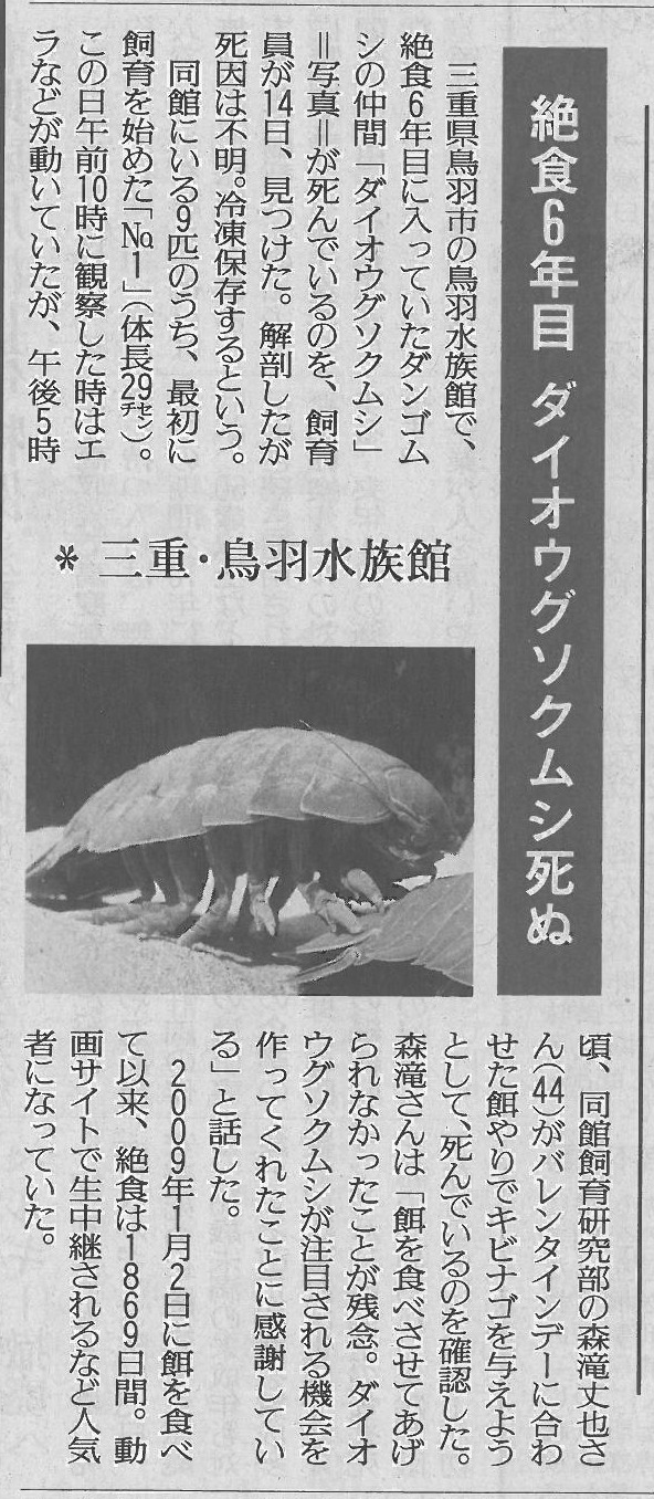今日は良い天気になっています。 今回の雪は甲府や前橋、八王子など記録的な大雪になって、連日ニュースでやっていましたが、富山ではせいぜい5cmくらいの積雪でした。 雪に慣れている富山でも、さすがに一晩で50cmも積もると大変です。 今日も「他の魚」?で昨日の読売新聞の「絶食6年目ダイオウグソクムシ死ぬ」の記事。 ![]() 絶食6年目。どうやって体を維持していたのでしょうか。 ずっとクソクイムシかと思っていたらグソク(具足)ムシだったのですね。失礼しました。 朝8時の大沢野大橋の水量は33.3t、水位は1.48m、萩浦橋の昨日の最高水温は3.4℃、今朝8時の水温は3.4℃、濁度8度、昨日の最高気温は3.0℃、今朝8時の気温は3.1℃ |