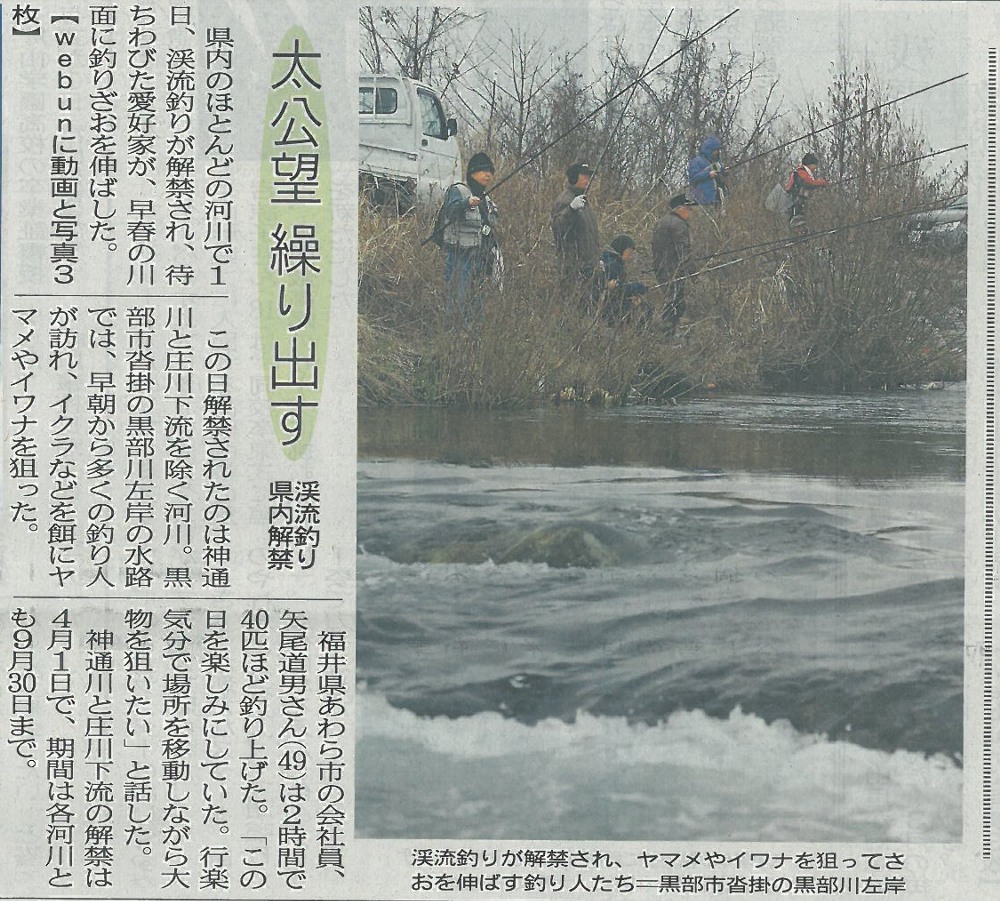 昨日は県内の多くの河川で渓流釣が解禁になりました。だた、富山漁協エリアと庄川下流域は4月1日です。 北日本新聞に「太公望くりだす」の記事が載っていました。 ![]() 一般的な渓流釣のイメージとは違いますが、解禁を待ちわびた多くの釣り人が訪れたといった雰囲気が出ています。 朝8時の大沢野大橋の水量は76.0t、水位は1.74m、萩浦橋の昨日の最高水温は6.6℃、今朝8時の水温は5.6℃、濁度7度、昨日の最高気温は8.2℃、今朝8時の気温は4.1℃ |