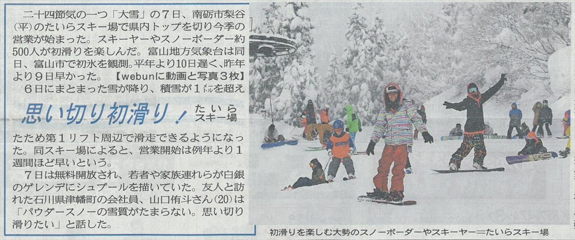 昨日は二十四節気の大雪(たいせつ)。 「こよみのページ」には “雪いよいよ降り重ねる折からなれば也(暦便覧) 朝夕には池や川に氷を見るようになる。大地の霜柱を踏むのもこの頃から。山々は雪の衣を纏って冬の姿となる頃。” と書いてあります。 今朝の北日本新聞には「思い切り初滑り!たいらスキー場」の県内トップのスキー場開きの記事もあり、本格的な冬に突入しました。 ![]() 朝8時の大沢野大橋の水量は39.5t、水位は1.53m、萩浦橋の昨日の最高水温は5.8℃、今朝8時の水温は5.1℃、濁度7度、昨日の最高気温3.7℃、今朝8時の気温は3.0℃ |