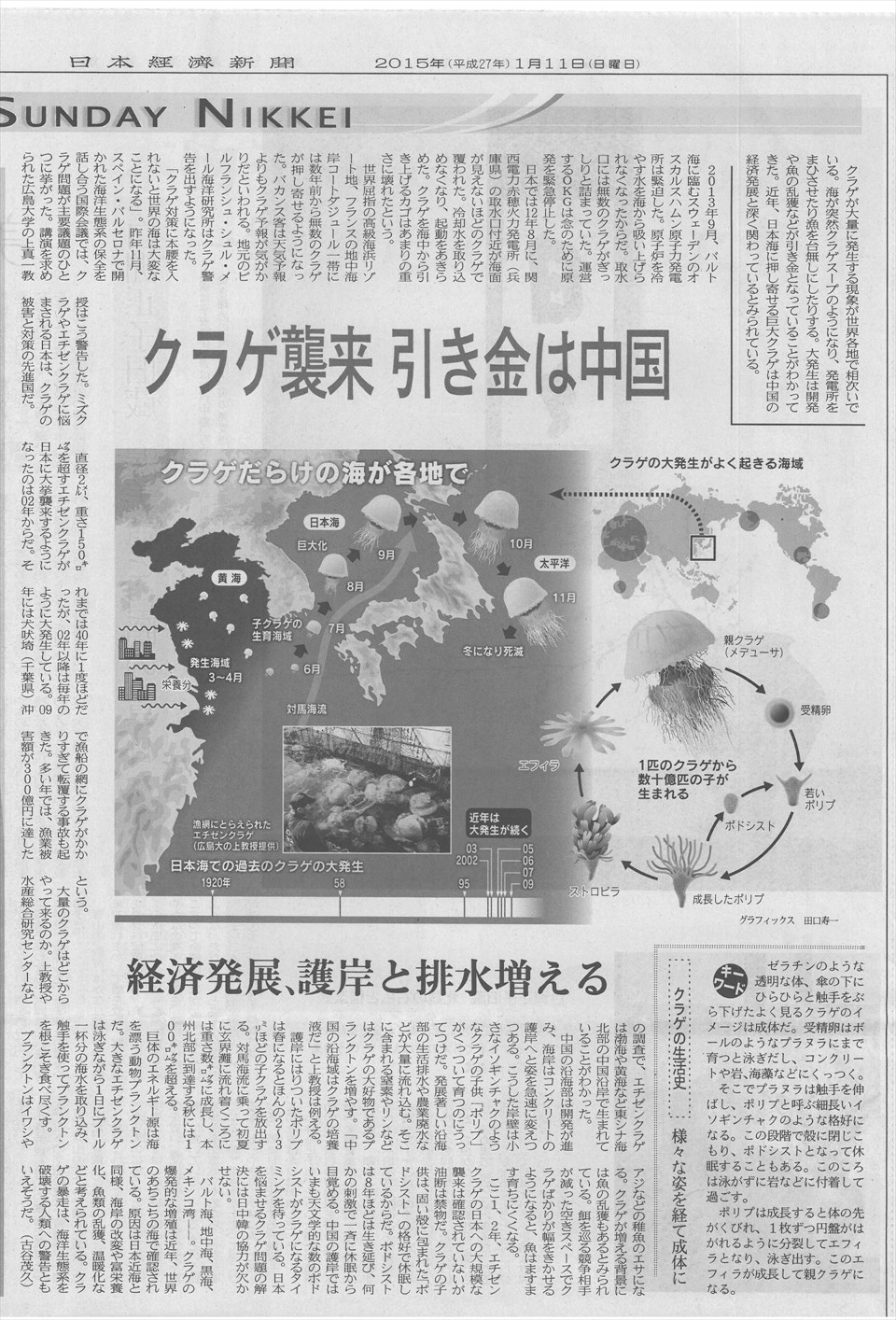 今日は久しぶりに良い天気になっています。積雪深は7cm。 天然そ上アユの不漁の原因の一つと言われているエチゼンクラゲの関連記事が1月11日の日経新聞に載っていました。 ![]() 16年の大不漁の時には、前年秋にエチゼンクラゲが大発生したので、アユ稚魚の餌になるプランクトンが極端に減って、生残が悪かったのではないかと言われました。 昨年はエチゼンクラゲの話は聞いていないので、今年も天然そ上は良いかもしれません。 朝8時の大沢野大橋の水量は23.4t、水位は1.39m、萩浦橋の昨日の最高水温は5.1℃、今朝8時の水温は4.1℃、濁度9度、昨日の最高気温3.5℃、今朝8時の気温は1.5℃ |