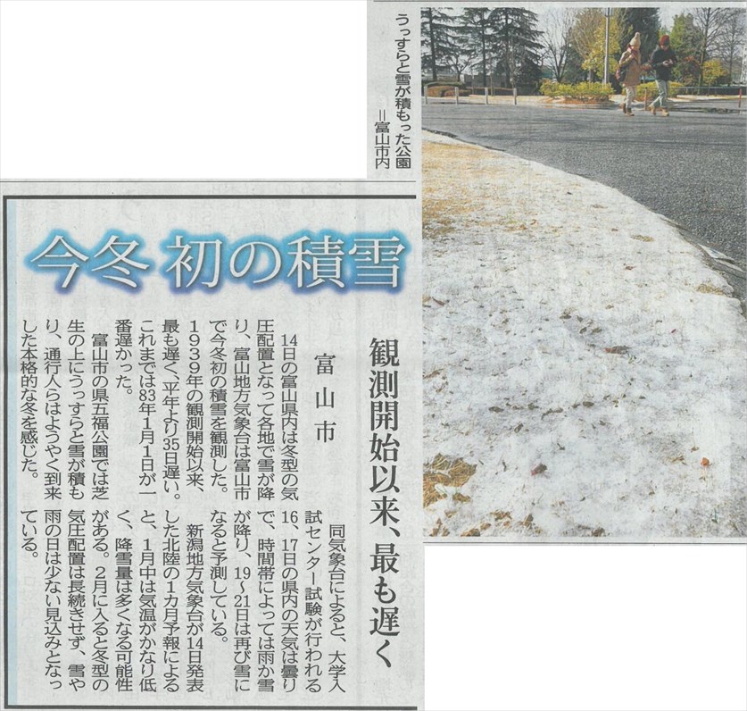 今日からセンター試験で足元が良い試験日になりました。皆さん頑張ってください。![]() 昨日の富山新聞に「今冬初の積雪」の記事が載っていましたが、事務所の駐車場にもようやく消雪ホースを準備しました。 ![]() 朝8時の大沢野大橋の水量は31.4t、水位は1.29m、萩浦橋の昨日の最高水温は5.9℃、今朝8時の水温は5.5℃、濁度6度、昨日の最高気温3.9℃、今朝8時の気温は3.7℃ |