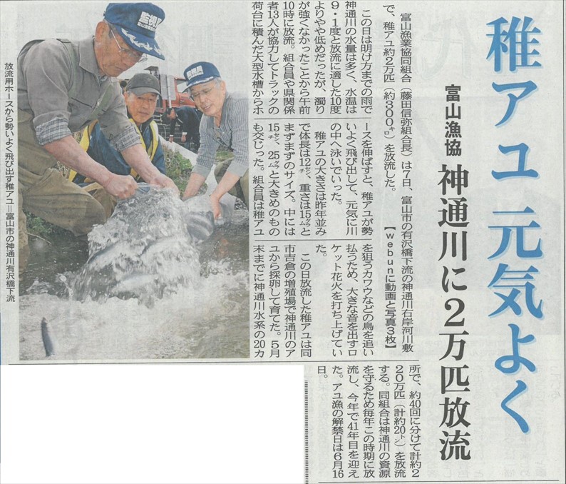 今日は良い天気になりそうですが、最高気温は15℃とそれほど暖かくならない予報です。 昨日に比べると110tほどの減水になっていますが、まだまだ釣りができるような状態ではありません。 ![]() ![]() 土曜日の北日本新聞にアユ初放流の記事が載っていました。 ![]() アユ放流再開は明日からの予定ですが、もう少し減水して欲しいところです。 8時の大沢野大橋の水量は389.9t、水位は2.45m、神通大橋の水量は517.6t、水位は2.47m、萩浦橋の昨日の最高水温は7.8℃、今朝8時の水温は7.2℃、昨日の最高気温11.3℃、今朝8時の気温は8.1℃ |