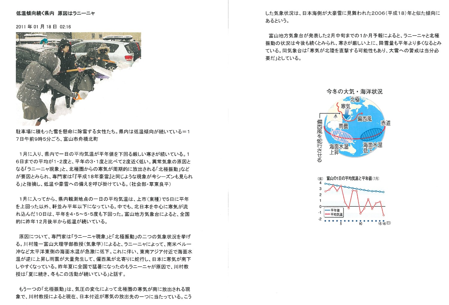 昨日の北日本新聞朝刊にこの冬の寒さは「ラニーニャ現象」と「北極振動」が要因との記事が出ていました。![]() 北日本新聞1月18日Webun記事 この状態は日本海側が大豪雪に見舞われた2006(平成18)年に似た傾向だそうなので、まだまだ大雪には警戒が必要です。 朝8時の大沢野大橋の水量は59.1t、水位は1.70m、萩浦橋の水温は昨日の最高が3.4℃、今朝は2.9℃、濁度11度、昨日の最高気温は4.2℃、今朝は3.0℃ |