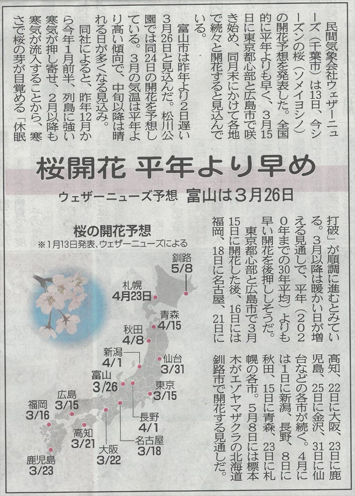今朝は冷たい雨が降っています。天気予報では今夜から雪に変わり、明日は大雪になるかもしれないということです。 今朝の積雪は18cm。今日の最高気温は3℃までしか上がらない予想になっています。 ![]() ![]() まだまだ寒い日が続きますが、富山新聞1月14日に「サクラ開花 平年より早め ウェザーニューズ予想」が早くも載っていました。 ![]() 富山は昨年より2日遅い3月26日の予想。あと2カ月後の予想なので当たるでしょうか。 8時の神3ダムの水量は18t、以前の大沢野大橋水位換算で1.15mくらい、現在の大沢野大橋観測所水位データは0.72m、昨日の萩浦橋の最高水温は4.5℃、8時の水温は3.8℃、昨日の最高気温は7.0℃、今朝8時の気温2.4℃ 今日の水況 平水、濁りなし |