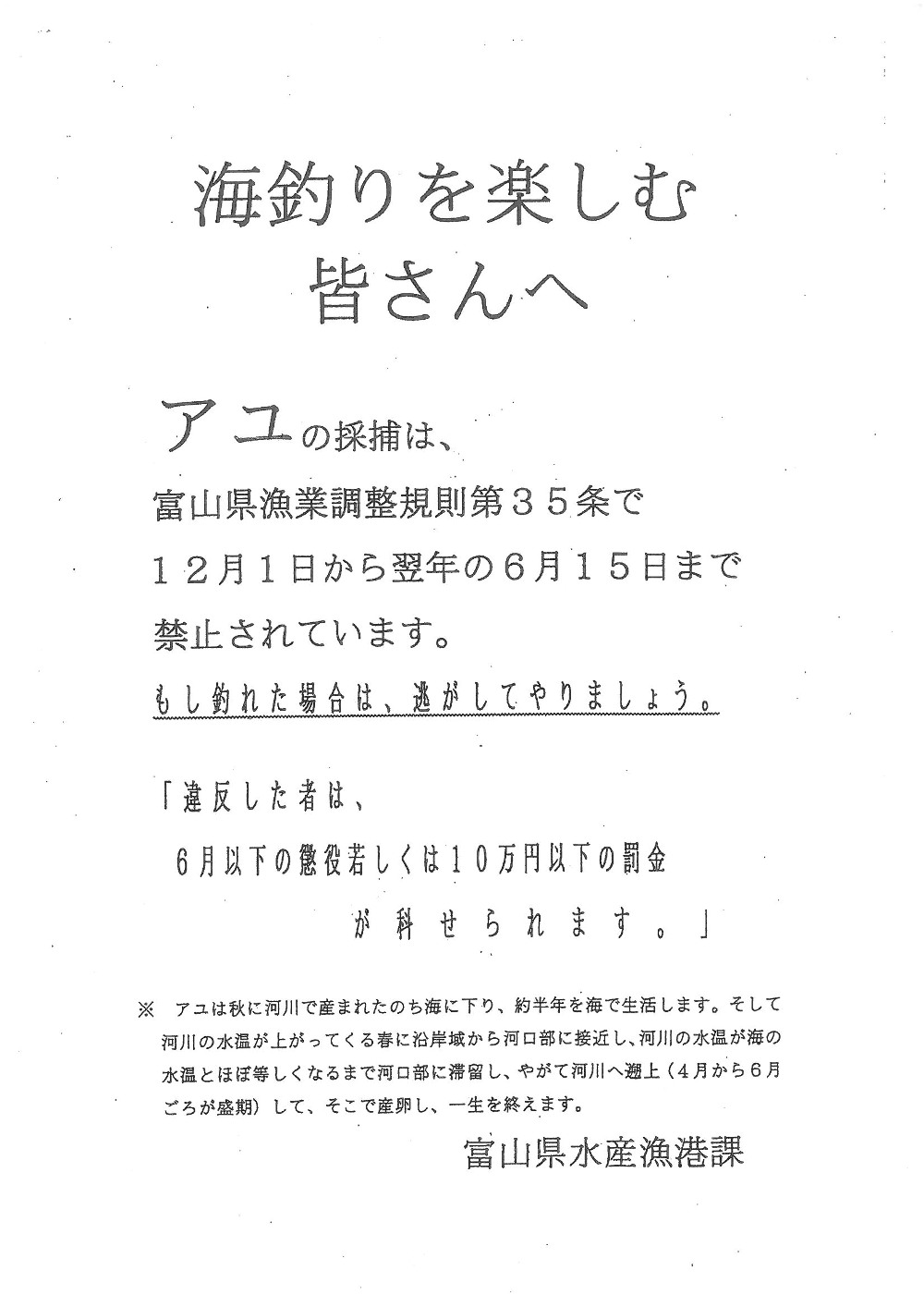 日ごとに暖かくなり、いくつかの漁港でアユを釣る人がいます。 富山県漁業調整規則には12月1日から6月15日まではアユを採捕してはいけないという規則があります。 ![]() 県では漁港を巡回して釣らないよう注意しているそうです。 朝8時の大沢野大橋の水量は118.9t、水位は1.98m、萩浦橋の水温は昨日の最高が11.6℃、今朝は7.8℃、濁度7度、昨日の最高気温は21.0℃、今朝は16.0℃ |
