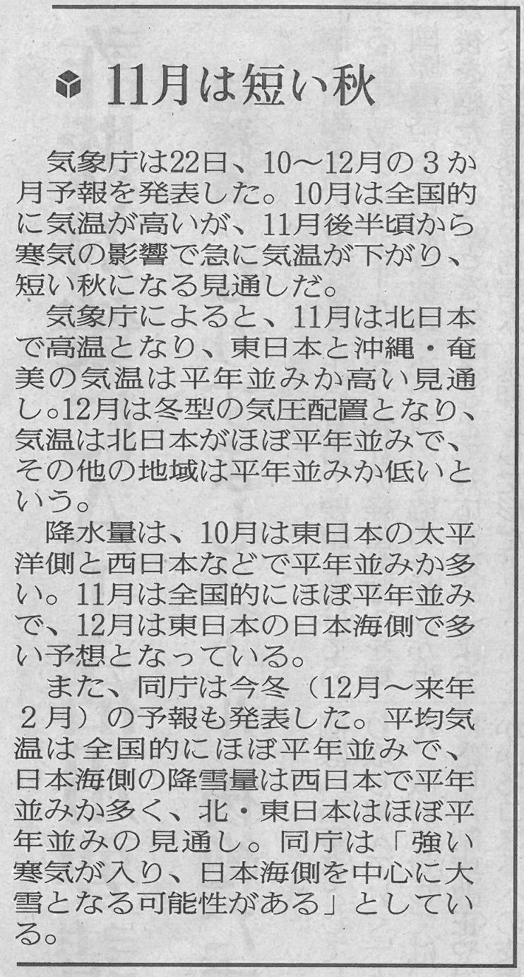 今朝も秋晴れ、予報では「晴れ後曇り」、最高気温は30℃の予想。 昨日の読売新聞に「11月は短い秋」の記事が載っていました。 ![]() 10月も気温が高い予想ですが、11月後半頃から急に気温が下がり、短い秋の予想です。 それよりも「冬は大雪の可能性がある」が気になります。 10月1日から15日まで禁漁期間になります。オトリ屋さんもそれに合わせて店じまいをされますので、10月16日以降に神通川で釣りをされる方はオトリの準備をする必要がありますので、ご注意ください。 ![]() ![]() 朝8時の神3ダム水量41t、以前の大沢野大橋水位換算で1.36mくらい、現在の大沢野大橋観測所水位データは0.87m、神通大橋観測所水位データ1.16m、昨日の最高気温は26.7℃、今朝8時の気温は24.1℃ 今日の水況 平水、濁りなし |