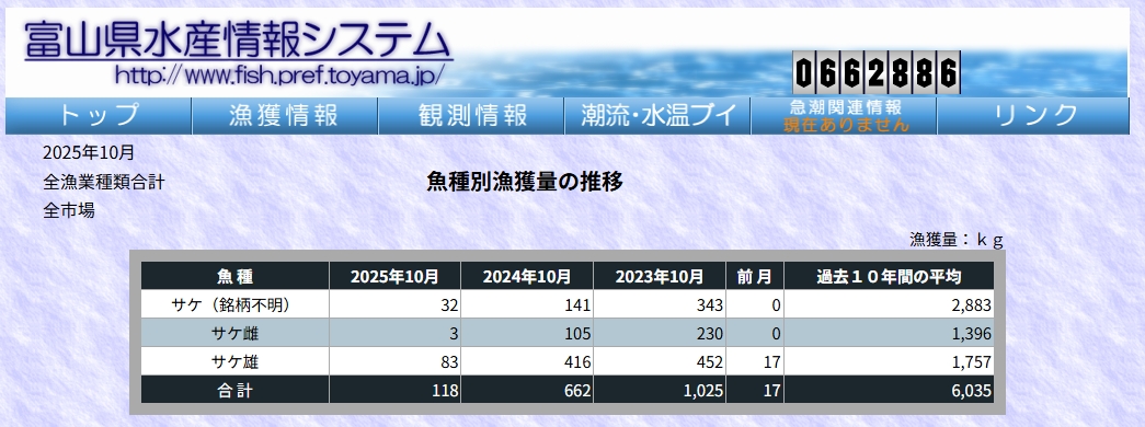 今朝は快晴、一日晴れの予報になっています。最高気温は20℃の予想。 今日は増殖場で停電騒ぎがあり、発電機の燃料も切れて、ギリギリのところで回復しました。アユを目一杯抱えているような時期だったら被害が出るような事態でした。 今年のサケ漁、神通川ではオスは少し捕まっているようですが、メスがまだ来ていないようです。今年はサケの海での捕獲情報もよくありません。 ![]() 過去10年平均の60分の1、昨年の6分の1程度。もう1週間ありますが、大変厳しい状況です。 ![]() ![]() 朝8時の神3ダム水量30t、以前の大沢野大橋水位換算で1.29mくらい、現在の大沢野大橋観測所水位データは0.76m、神通大橋観測所水位データ1.15m、昨日の最高気温は16.9℃、今朝8時の気温は14.8℃ 今日の水況 平水、濁りなし |