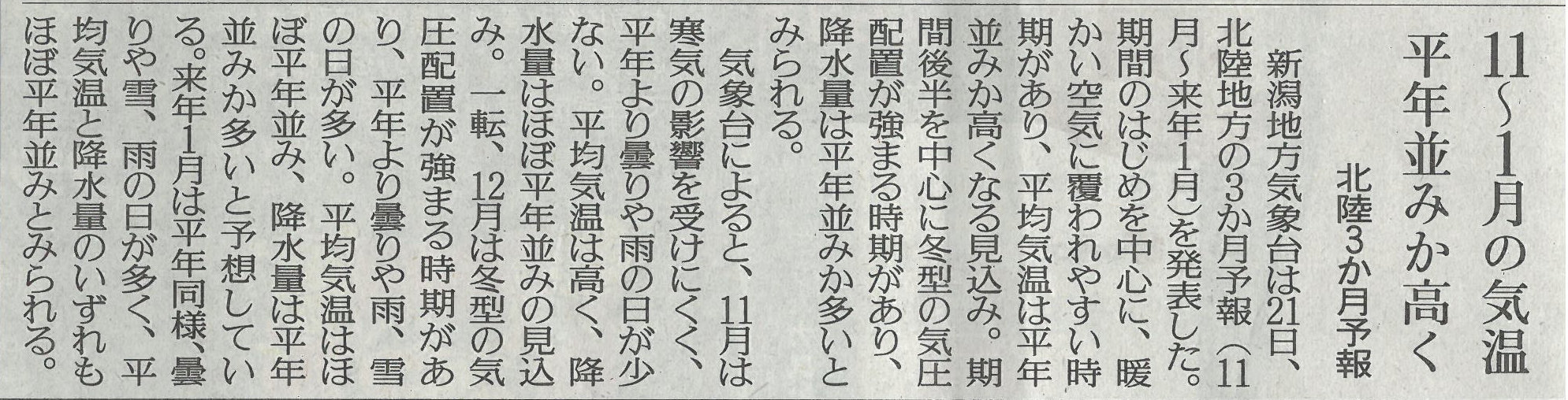 | 今日も快晴。最高気温は20℃の予想になっています。 昨日、ようやく増殖場にサケのメスが2本入ってきたようです。 10月20日の読売新聞に北陸3カ月予報が出ていました。  11月は平均気温が高めのようですが、12月は冬型の天気になり、気温はほぼ平年並みの予想。   朝8時の神3ダム水量21t、以前の大沢野大橋水位換算で1.22mくらい、現在の大沢野大橋観測所水位データは0.72m、神通大橋観測所水位データ1.03m、昨日の最高気温は19.7℃、今朝8時の気温は12.7℃ 今日の水況 平水、濁りなし | ||