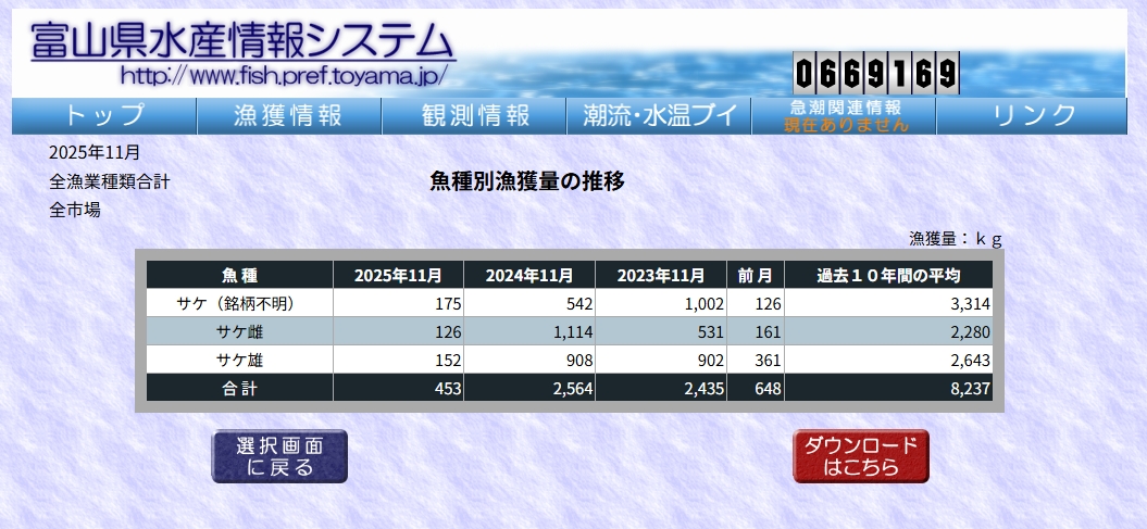 大雨を心配しましたが、8mm程度の雨で済みました。今日は「雨後曇り」、最高気温は14℃までしか上がらない予想です。 これからサケマス施設の移転に伴い河川取水施設の解体の国交省検査のために、朝一で現場に行ってきます。雨が強く降らなければ良いのですが。 昨日書き込んだ海のサケ漁獲量のデータを載せておきます。 ![]() 北海道、東北も前年比大幅減なので、サケ回帰の南域にあたる富山では激減するのも仕方ありません。 ![]() ![]() 朝8時の神3ダム水量20t、以前の大沢野大橋水位換算で1.21mくらい、現在の大沢野大橋観測所水位データは0.72m、神通大橋観測所水位データ1.05m、昨日の最高気温は16.4℃、今朝8時の気温は9.0℃ 今日の水況 平水、濁りなし |