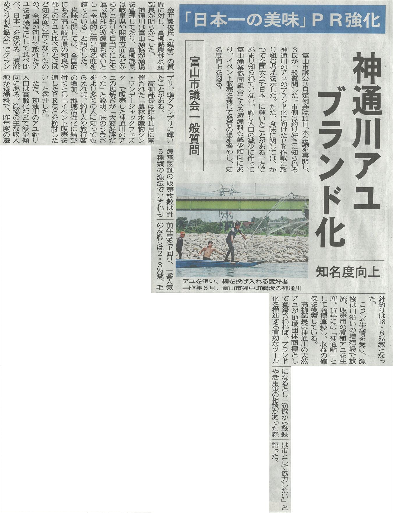 今朝は曇り空。場所によっては雪が降ったようで、寒い朝になっています。予報は「曇り時々雨か雪」、最高気温は8℃の予想。 昨日の富山新聞に富山市議会一般質問の中で「神通川アユブランド化」の大きな記事が載っていました。 ![]() 神通川のアユ漁業を管理する富山漁協にとって大変ありがたいことです。 ![]() ![]() 8時の神3ダム水36t、以前の大沢野大橋水位換算で1.33mくらい、現在の大沢野大橋観測所水位データは0.82m、神通大橋観測所水位データ1.07m、昨日の最高気温は9.8℃、今朝8時の気温2.7℃ 今日の水況 平水、濁りなし |