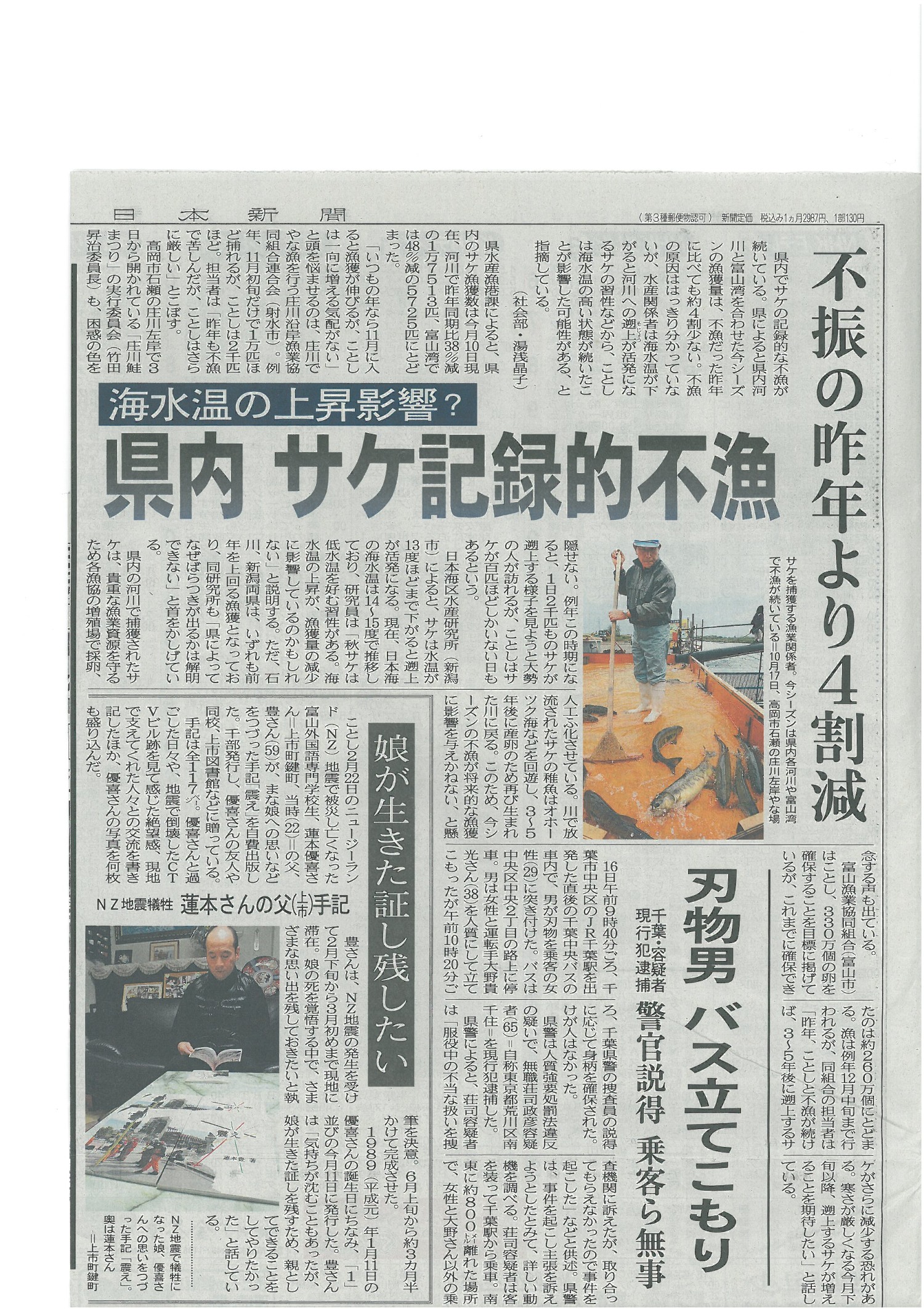 北日本新聞11月17日朝刊に「サケ記録的不漁」の記事が載りました。![]() 山形や新潟では11月になって持ち直してきましたが、富山ではそれもなく、もうそろそろシーズンも終了しそうです。 週間天気予報を見ると、来週はぐずついた天気が続きそうです。 朝8時の大沢野大橋の水量は94.7t、水位は1.91m、萩浦橋の水温は昨日の最高が12.5℃、今朝8時で12.2℃、濁度6度、昨日の最高気温は18.7℃、今朝は19.2℃ |