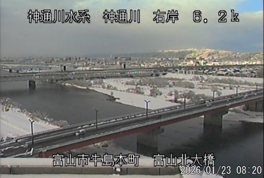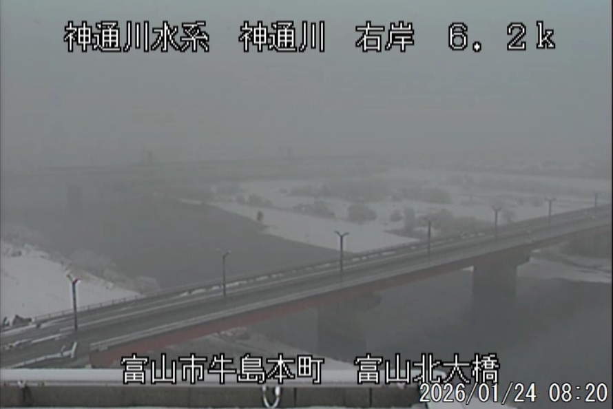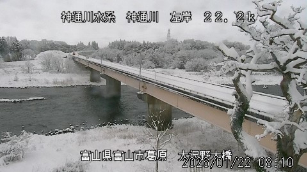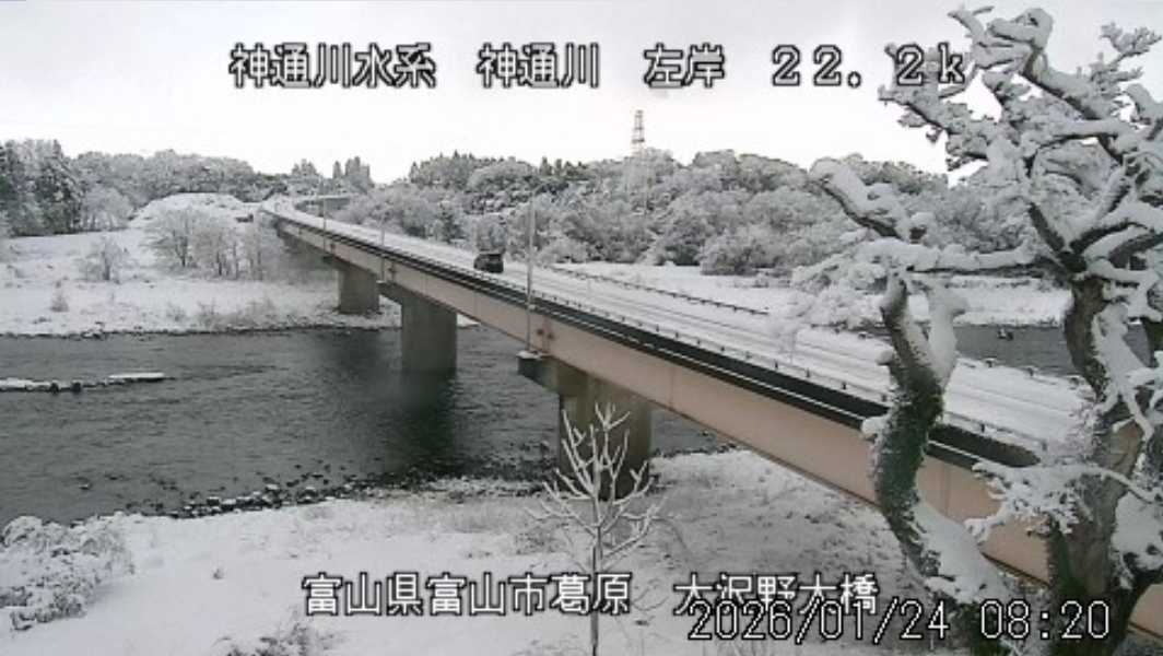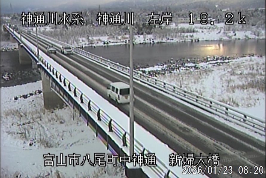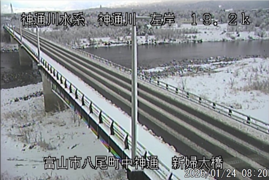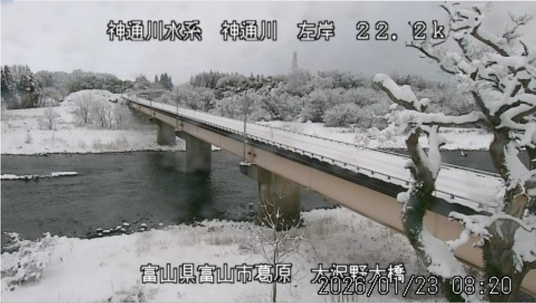 今朝は日差しも出て雪が少し積もった程度ですが、冷え込みが強く朝8時の気温が―1.5℃。 予報では、今日は「雪時々止む」。今夜から明日一杯が寒波のピークになりそうです。 ![]() 神3ダム下流左岸からの組合カメラから。ライブで見ることができます。 ![]() ![]() 朝8時の神3ダム水量45t、以前の大沢野大橋水位換算で1.39mくらい、現在の大沢野大橋観測所水位データは0.88m、神通大橋観測所水位データ1.20m、昨日の最高気温は7.7℃、今朝8時の気温−1.5℃ 今日の水況 平水、濁りなし |