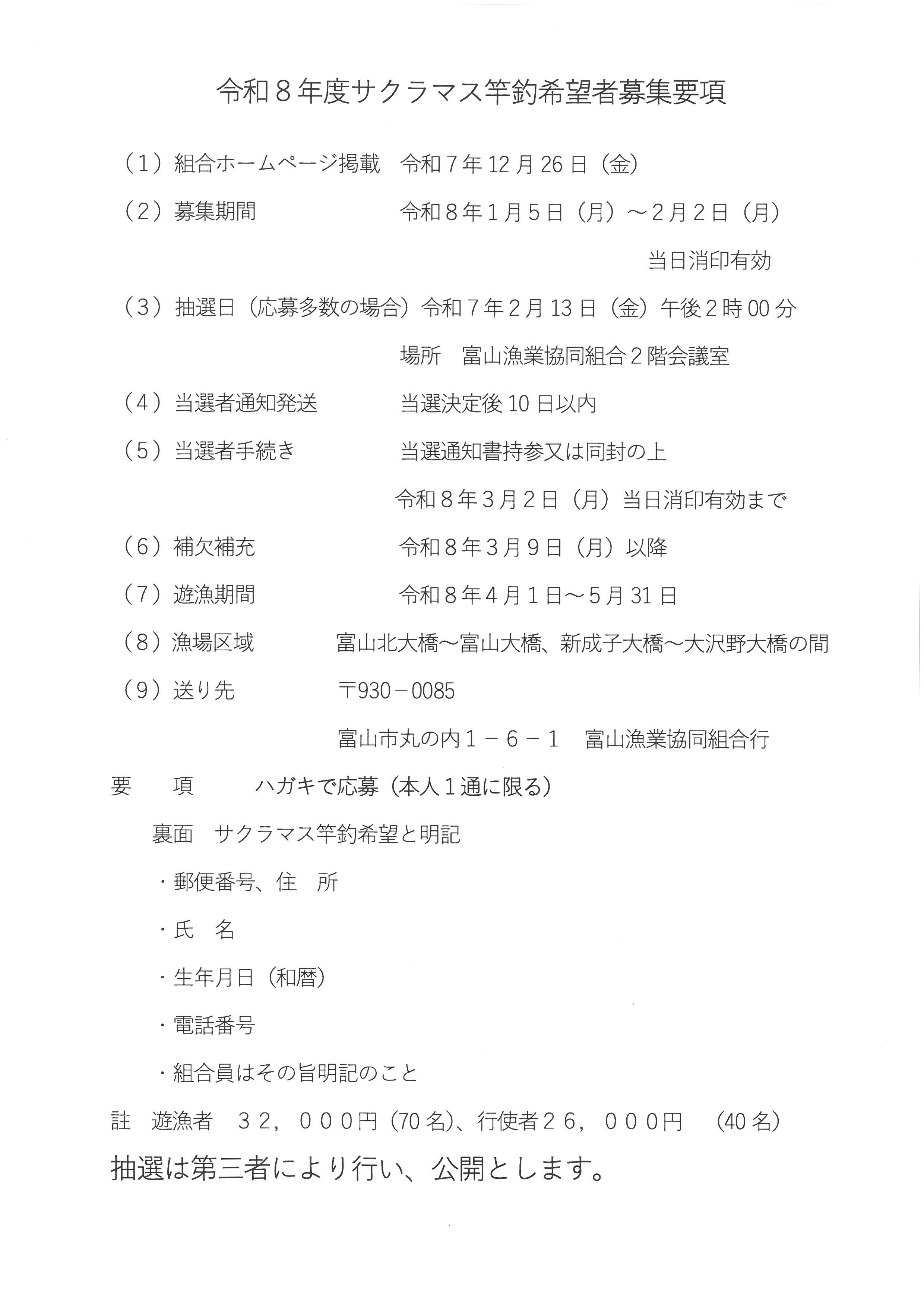 今朝は曇り空。予報では「雪時々止む」、最高気温は6℃の予想になっています。 暦どおり、四日頃からは気温が上がって、少し春が近づくような陽気になりそうです。 4月からのサクラマス竿釣応募の締め切りが今日の消印まで有効です。募集要項を再度アップしておきます。 ![]() ![]() ![]() 朝8時の神3ダム水量21t、以前の大沢野大橋水位換算で1.22mくらい、現在の大沢野大橋観測所水位データは0.73m、神通大橋観測所水位データ0.98m、昨日の最高気温は4.4℃、今朝8時の気温1.7℃ 今日の水況 平水、濁りなし |