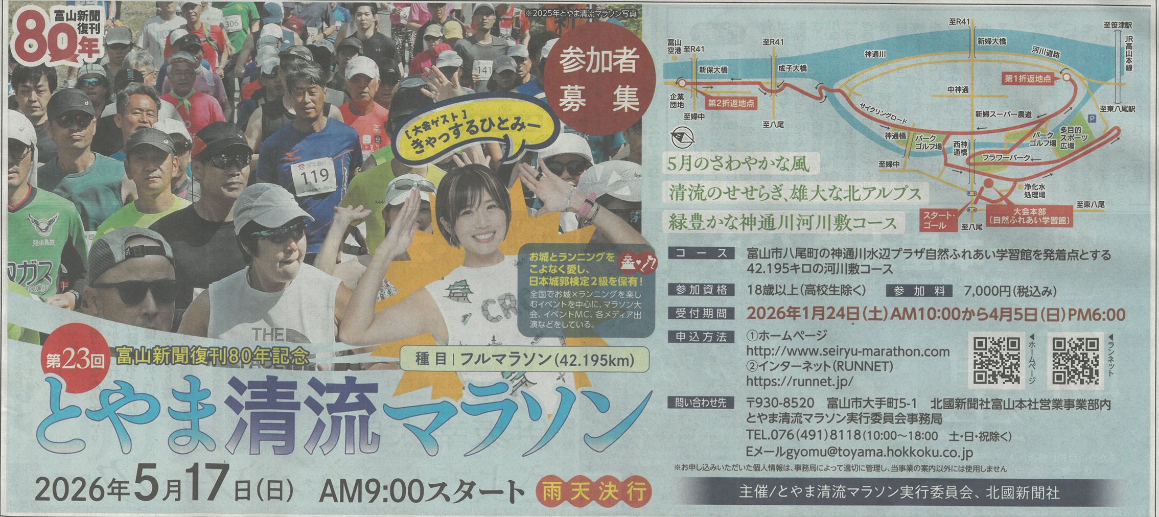 今朝は曇り空。日付が変わった頃に8.4℃の気温を観測していますが、最高気温の予想は7℃になっています。 さすがに昨日の暖かさで積雪はゼロになりました。 土曜日の富山新聞に、第23回の“とやま清流マラソン”の参加募集広告が出ていました。 ![]() 5月17日(日)に成子大橋から新保大橋の堤防道路がコースの一部になり、サクラマスの投網や釣区間に被りますので、ご協力をお願いします。 ![]() ![]() 朝8時の神3ダム水量10t、以前の大沢野大橋水位換算で1.00mくらい、現在の大沢野大橋観測所水位データは0.58m、神通大橋観測所水位データ1.06m、昨日の最高気温は17.8℃、今朝8時の気温6.2℃ 今日の水況 平水、濁りなし |
