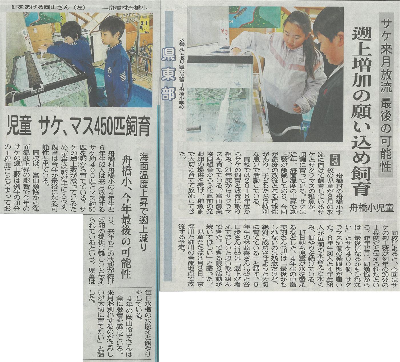 昨夜は雪は降らなかったようですが午後から荒れた天気になり、富山では春一番を観測したと発表がありました。 今朝は曇り空。予報では「曇り後晴れ」、最高気温は6℃までしか上がらない予想ですが、明日からはまた暖かくなるようです。 昨日の新聞に舟橋小学校で、富山漁協が提供したサケ、サクラマスの卵を上手に育ててくれて、3月始めには地元の川に放流する記事が、新聞に大きく載っていました。左半分が富山新聞、右が北日本新聞です。 ![]() サケの遡上が悪く、今後続けることができるか心配です。 ![]() ![]() 朝8時の神3ダム水量18t、以前の大沢野大橋水位換算で1.15mくらい、現在の大沢野大橋観測所水位データは0.73m、神通大橋観測所水位データ1.01m、昨日の最高気温は11.4℃、今朝8時の気温0.7℃ 今日の水況 平水、濁りなし |