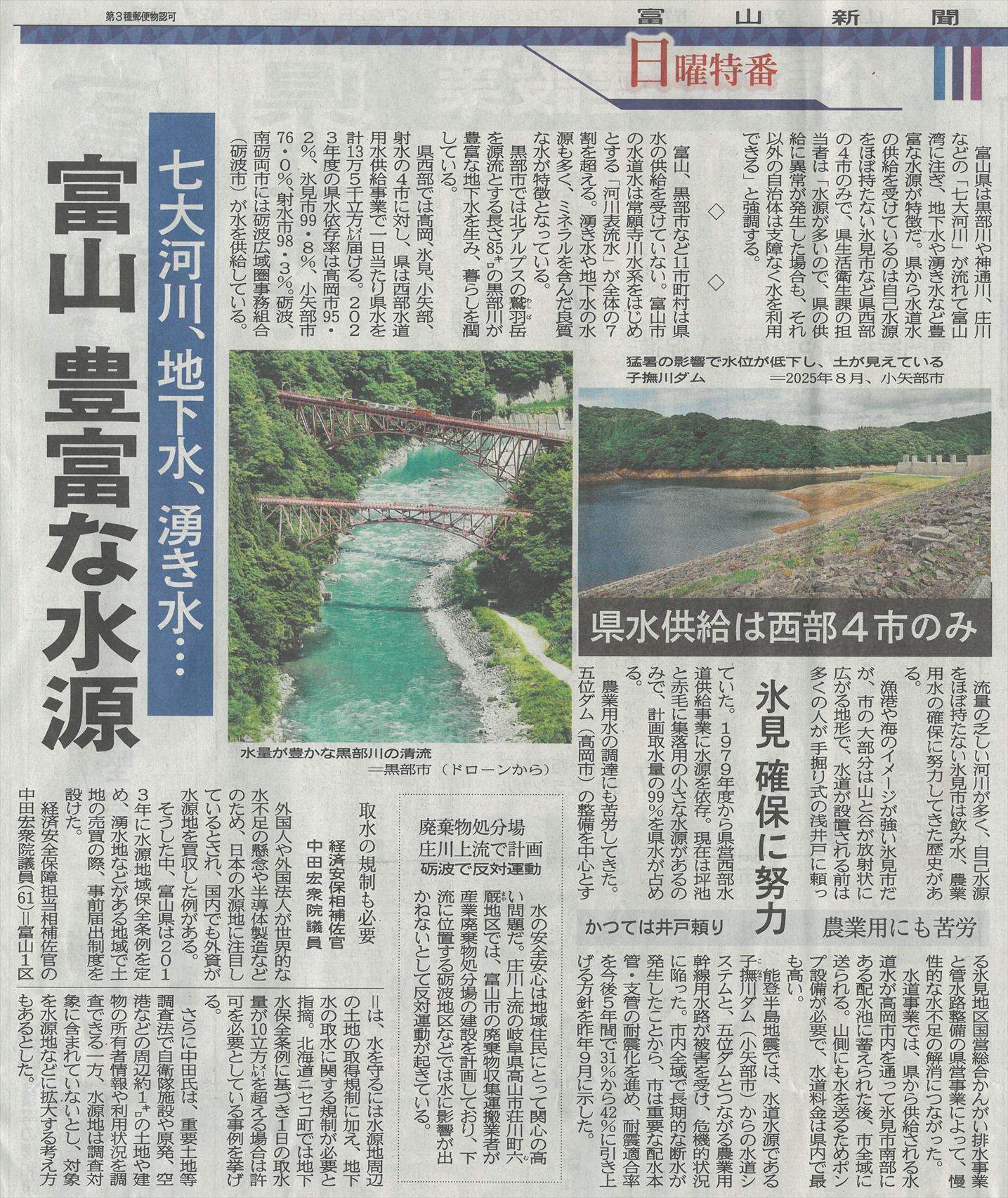 今朝は良い天気ですが、予報では「晴れ一時雨」。最高気温は12℃の予想になっています。 連日の暖かさで雪解けが進んだようで、富山市猪谷の積雪が0センチになりました。神3ダムからの放水が66tになり、60tを超えたのは12月27日以来です。 明日は一日雨の予報。太平洋側は恵みの雨になりそうですが、富山は冬の積雪の苦労はあるものの、まず節水など心配することはほとんどありません。 2月22日の富山新聞に“日曜特集 富山 豊富な水源”の記事が載っていました。 ![]() ![]() ![]() 朝8時の神3ダム水量66t、以前の大沢野大橋水位換算で1.50mくらい、現在の大沢野大橋観測所水位データは1.11m、神通大橋観測所水位データ1.44m、昨日の最高気温は16.6℃、今朝8時の気温4.1℃ 今日の水況 平水、濁りなし |