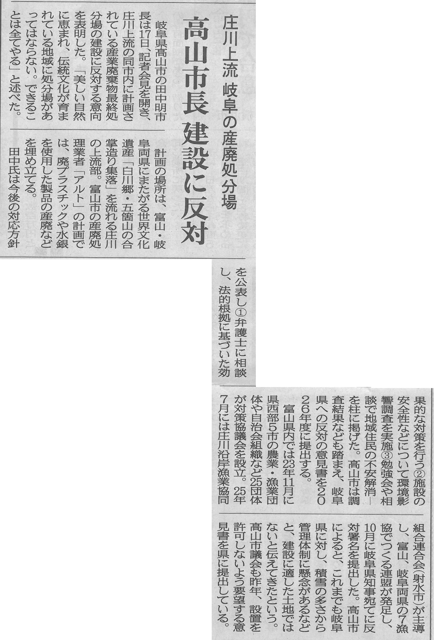今朝も良い天気、予報では「晴れ後曇り」になっています。最高気温は16℃の予想。 庄川の最上流部に計画されている産業廃棄物最終処分場について、行政区域の高山市長が建設反対を表明されたことが、11月18日の北日本新聞に載っていました。 ![]() 飛騨5漁協と庄川漁連、富山漁協の飛越7漁協は反対署名活動を行い、岐阜県知事に提出しています。 ![]() ![]() 朝8時の神3ダム水量36t、以前の大沢野大橋水位換算で1.33mくらい、現在の大沢野大橋観測所水位データは0.84m、神通大橋観測所水位データ1.08m、昨日の最高気温は12.2℃、今朝8時の気温は6.6℃ 今日の水況 平水、濁りなし |