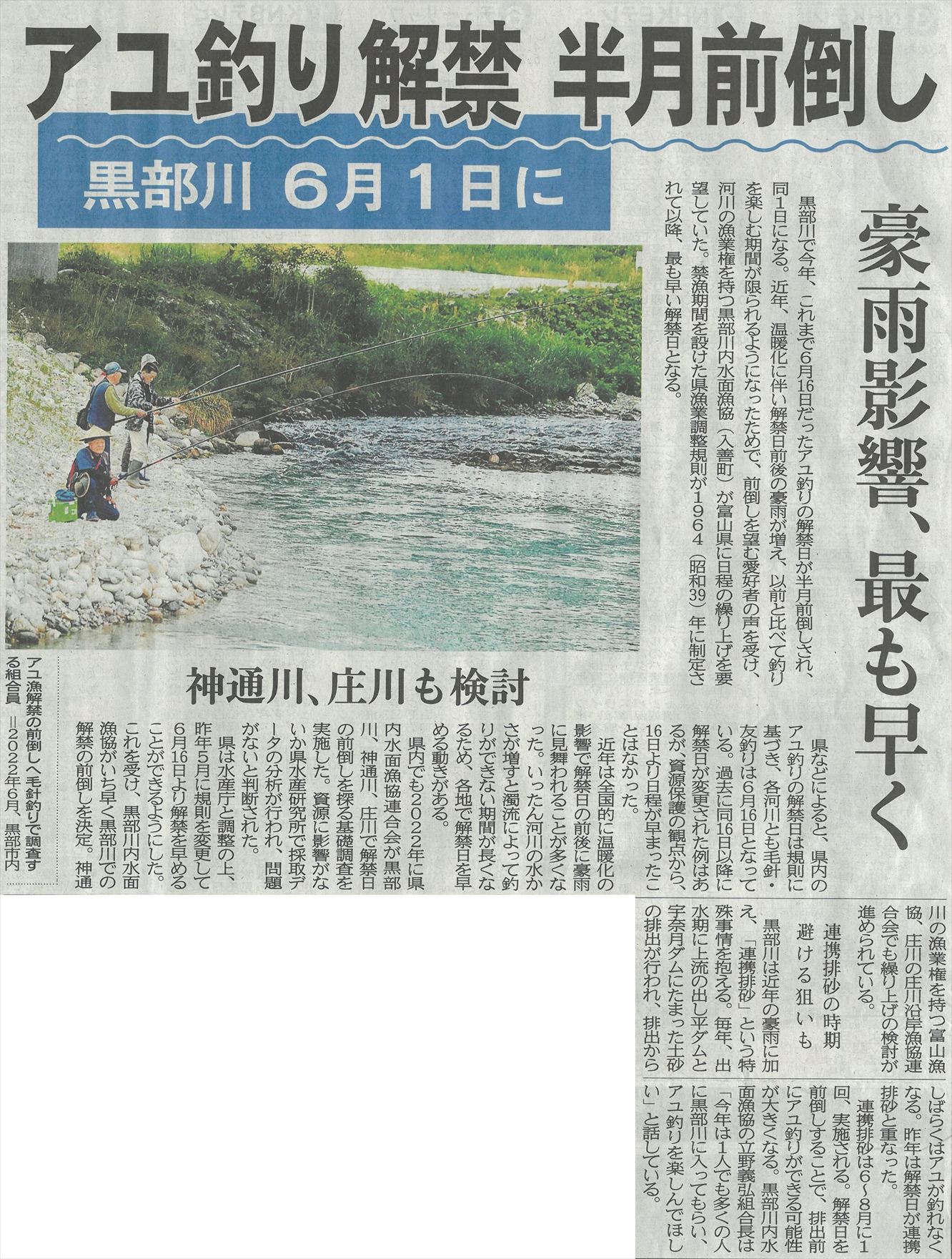 今朝は雪が止み、予報では「曇り後晴れ」、最高気温は6℃の予想。 富山の積雪は4cmですが、飛騨河合では50cmの積雪になっています。 ニュースでは3連休に寒波の予想ですが、富山では、日、月に雪が降り、積雪もありそうです。 1月7日の富山新聞に「アユ釣り解禁 半月前倒し」の大きな記事が載っていました。 ![]() 昨年、ようやく富山県漁業調整規則のアユ禁止期間が5月31日までに15日間短縮する規則変更が完了し、遊漁規則、行使規則変更手続きを完了した、黒部川、庄川、神通川でアユ釣解禁日を早めることができるようになりました。アユ釣解禁日については、今後役員会で検討する予定です。 ![]() ![]() 朝8時の神3ダム水量25t、以前の大沢野大橋水位換算で1.25mくらい、現在の大沢野大橋観測所水位データは0.80m、神通大橋観測所水位データ1.13m、昨日の最高気温は4.8℃、今朝8時の気温0.0℃ 今日の水況 平水、濁りなし |