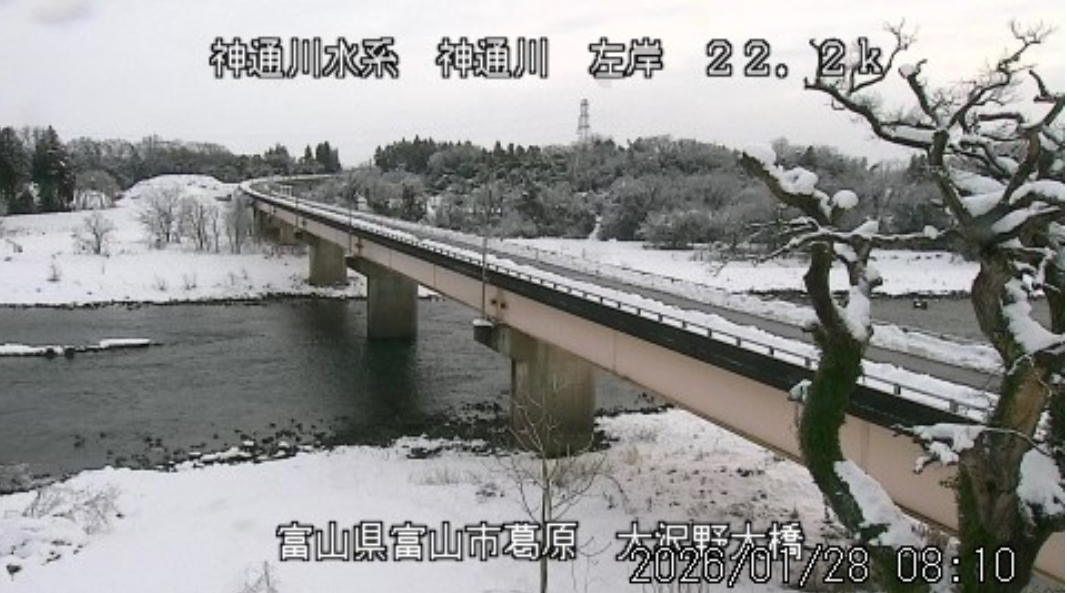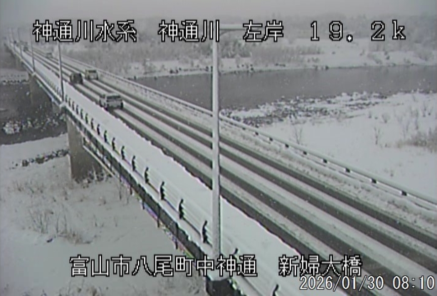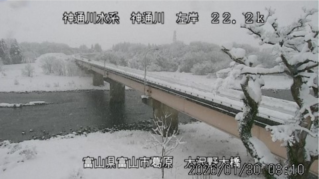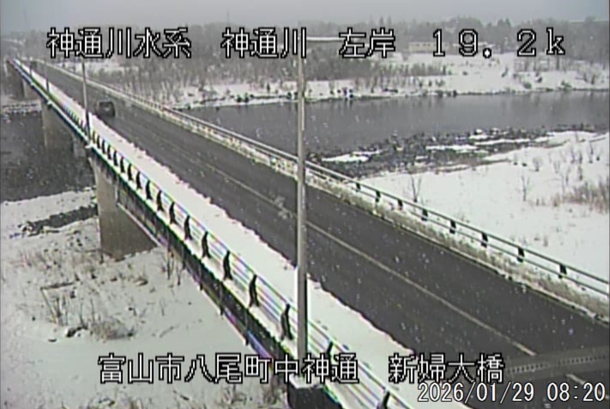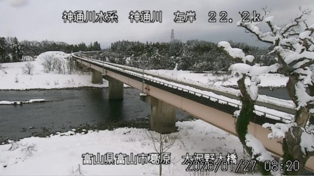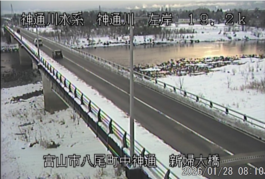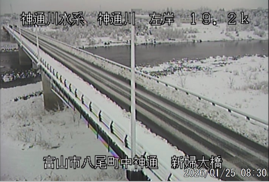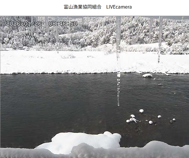 今朝は日差しも出て雪が少し積もった程度ですが、冷え込みが強く朝8時の気温が―1.5℃。 予報では、今日は「雪時々止む」。今夜から明日一杯が寒波のピークになりそうです。 ![]() 神3ダム下流左岸からの組合カメラから。ライブで見ることができます。 ![]() ![]() 朝8時の神3ダム水量45t、以前の大沢野大橋水位換算で1.39mくらい、現在の大沢野大橋観測所水位データは0.88m、神通大橋観測所水位データ1.20m、昨日の最高気温は7.7℃、今朝8時の気温−1.5℃ 今日の水況 平水、濁りなし |
