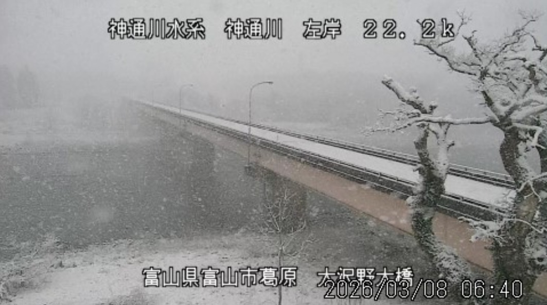 今朝は雪模様。大沢野大橋では真っ白に雪が積もっています。 天気予報では「雪のちくもり」、最高気温は7℃の予想になっています。 昨日は今年度最後のカワウ調査に行ってきましたが、神通川河口や常願寺川近くのサギの森では、たくさんのカワウがいました。 ![]() 神通川河口 ![]() サギの森 ![]() 朝8時の神3ダム水量86t、以前の大沢野大橋水位換算で1.59mくらい、現在の大沢野大橋観測所水位データは1.09m、神通大橋観測所水位データ1.41m、昨日の最高気温は9.6℃、今朝8時の気温1.1℃ 今日の水況 平水、濁りなし |