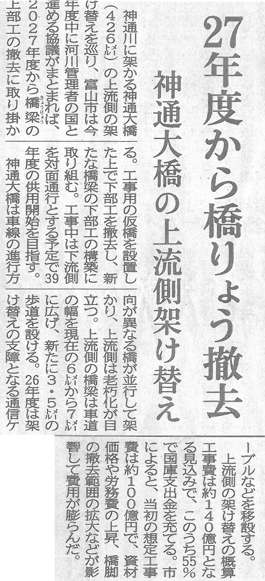 今朝は薄曇りですが、暖かい良い天気になりそうです。予報は「曇り時々晴れ」、最高気温は23℃まで上がる予想。 4月18日の富山新聞に、神通大橋の上流側の架け替え工事の記事が載っていました。 ![]() 10年ほど前に富山大橋の架け替え工事で河川環境が大きく変わったことがあり、漁協とすればありがたくない工事です。ただ神通大橋の上流側はかなり古くなり車道も狭いので架け替えは必要ですが、どうすれば影響が少なくなるか漁協の意見も十分聞いてもらうようお願いします。 ![]() 8時の神3ダム水量58t、以前の大沢野大橋水位換算で1.46mくらい、現在の大沢野大橋観測所水位データは0.97m、神通大橋観測所水位データ1.18m、昨日の最高気温は16.3℃、今朝8時の気温14.4℃ 今日の水況 平水、濁りなし |